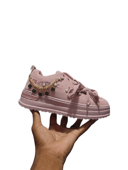 সাজানো পিংক রঙের স্নিকার্স, যার সাইডে রয়েছে কালো ও সোনালি বিডের ঝুলন্ত চেইন ডিজাইন। প্রতিদিনের ফ্যাশনে কিংবা অনুষ্ঠানে ব্যবহারের জন্য একদম পারফেক্ট।